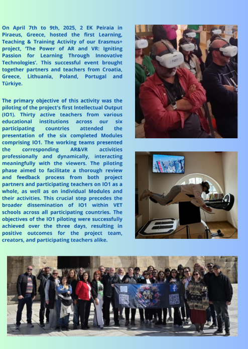 We are proud to celebrate the successful completion of the first year of our Erasmus+ project “The Power of AR and VR: Igniting Passion for Learning Through Innovative Technologies”! 🎉 This past year has been an incredible journey of learning, collaboration, and innovation, and we are deeply grateful to all our international partners for their commitment and active involvement.