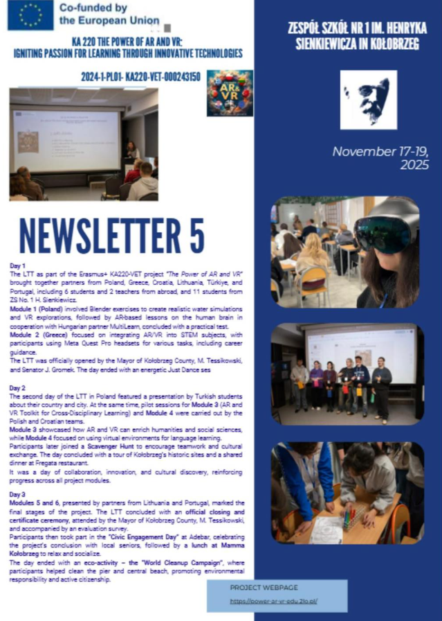 As part of the The Power of AR and VR project, a newsletter has been created to regularly share updates, events, and achievements of the project. Each edition includes reports from workshops, webinars, LTT mobilities, and other educational activities related to AR and VR technologies. The newsletter also serves as a platform for sharing experiences, inspirations, and teaching materials, facilitating knowledge exchange among project partners and the wider educational community.